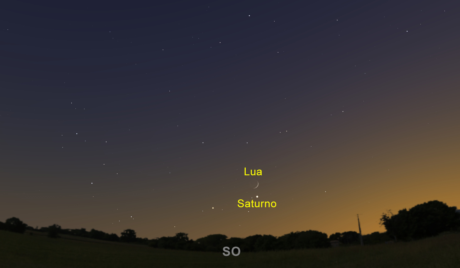 Dia 16, virados a Sudoeste ao anoitecer e separados por 3 graus, encontrarão a Lua e o único dos planetas visíveis a olho nu que não está visível de madrugada – Saturno.