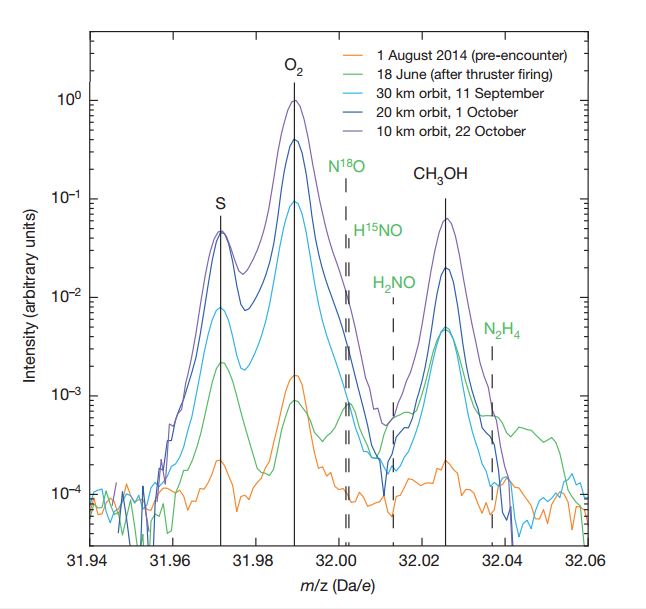 Entre Setembro de 2014 e Março de 2015, o espectrómetro de massa ROSINA-DFMS, instalado a bordo da sonda Roseta, realizou medições dos gases da atmosfera do cometa. Estes dados foram estudados por uma equipa internacional liderada por André Bieler, da Universidade do Michigan (EUA), e revelaram que o oxigénio molecular (O2) é o quarto gás mais comum na atmosfera da cabeleira do cometa, a seguir à água, ao monóxido de carbono e ao dióxido de carbono. Os resultados dessas medições e a respectiva interpretação foram publicados na revista Nature da semana que passou (http://www.nature.com/nature/journal/v526/n7575/full/nature15707.html).
