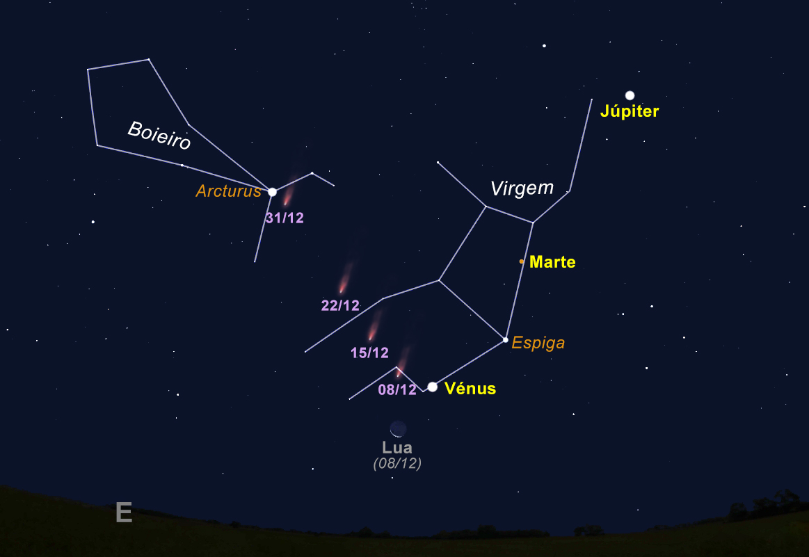 Fig1: O céu virado a Sudeste, às 6 da manhã de dia 8 de dezembro. Nesta imagem também está indicado o trajeto do cometa C/2013 US10 (Catalina) até ao último dia do ano.