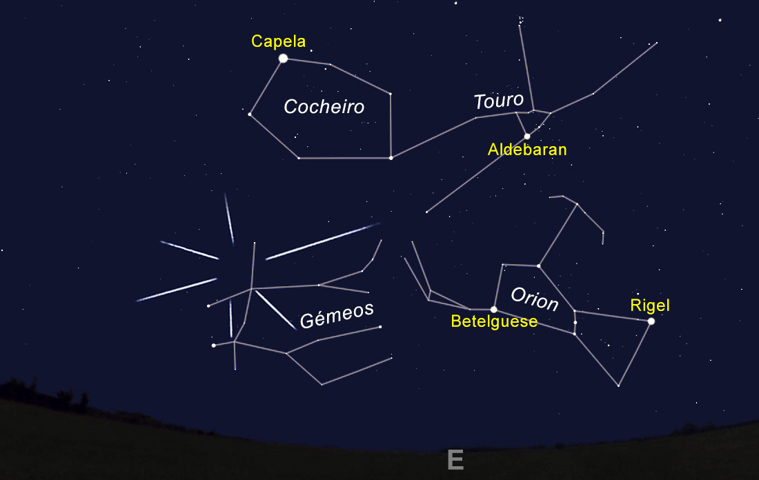 Dia 14, por volta das 18 horas, será o máximo da chuva de meteoros das Geminíadas. Esta chuva tem um número previsto de meteoros por hora de 120 (em céus escuros), e com a Lua num fino crescente a não atrapalhar as observações, esta poderá ser uma noite bastante interessante para observar meteoros.
