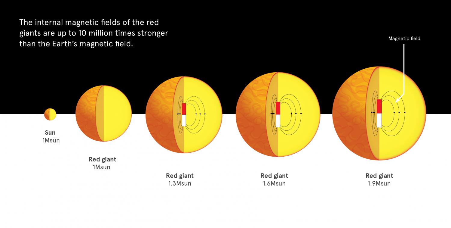 Curiosamente, quando olharam para as características das gigantes vermelhas em que detectaram campos magnéticos, verificaram que estas tinham massas superiores a 1,3 vezes a do Sol. Os astrónomos pensam que estes campos são “fósseis” de campos magnéticos intensos que estas estrelas teriam tido quando ainda estavam na Sequência Principal transformando hidrogénio em hélio. Os núcleos destas estrelas transferem energia através da convecção do plasma super aquecido. As partículas carregadas electricamente em movimento neste plasma funcionam como um dínamo, gerando um campo magnético intenso. Estes campos, os astrónomos descobriram agora, permanecem ancorados nos interiores das estrelas, mesmo depois delas evoluírem para fora da Sequência Principal. Estrelas menos maciças, como o Sol, não têm núcleos convectivos enquanto se encontram na Sequência Principal e portanto não geram este tipo de campos magnéticos internos. De facto, em gigantes vermelhas com massas semelhantes à do Sol, os astrónomos não detectaram campos magnéticos.