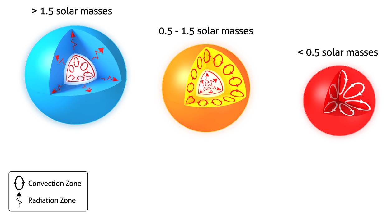 Figura 2 - Na sequência principal, estrelas maciças têm núcleos convectivos e estrelas menos maciças periferias convectivas. Crédito: Pearson Education Inc.