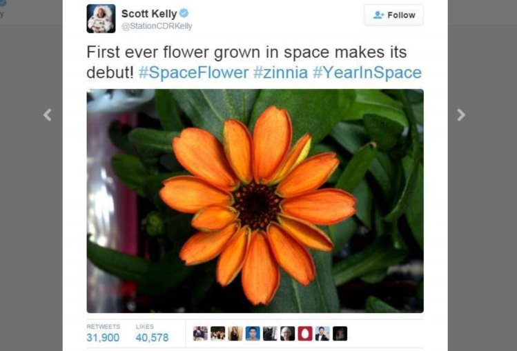 No passado dia 16 de Janeiro, o astronauta norte-americano Scott Kelly, comandante da actual missão da Estação Espacial Internacional, publicou na sua conta no Twitter a seguinte frase: “Primeira flor de sempre a crescer no espaço faz a sua estreia”. A flor é de uma zínia (Zinnia é um género botânico pertencente à família Asteraceae) e a notícia espalhada naquela rede social fez com que inúmeros meios de comunicação social internacionais divulgassem o acontecimento, tal como se tivesse sido a primeira vez que uma planta tivesse florido no espaço.