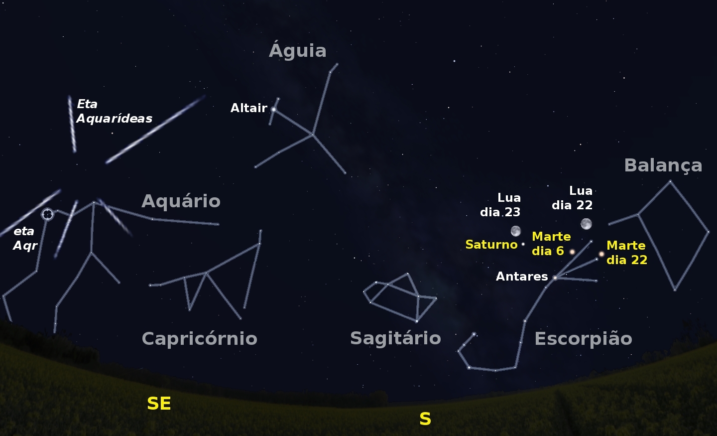 Figura 1: Céu a Sudeste pelas 5 horas da madrugada de dia 6. É visível o radiante da chuva destrelas Eta Aquáridas junto com os planetas Saturno e Marte, mais algumas constelações e estrelas de relevo. Igualmente, podemos encontrar a posição de Marte na madrugada de dia 22 e da Lua nas madrugadas de dias 22 e 23. (Imagem adaptada de Stellarium)