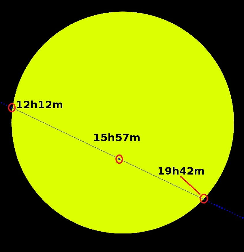 Figura 2: Representação do trânsito de Mercúrio de dia 9 de maio. A informação temporal corresponde à hora legal em Portugal continental. (Imagem adaptada de: https://commons.wikimedia.org/wiki/File:Transit_of_Mercury_May_9_2016_path_across_sun.png#filelinks)