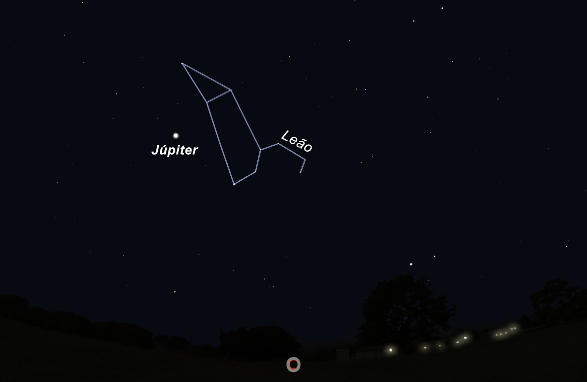 Figura 1: Júpiter na constelação do Leão, a Oeste, por volta das 22h30. (Imagem: Ricardo Cardoso Reis/Stellarium)