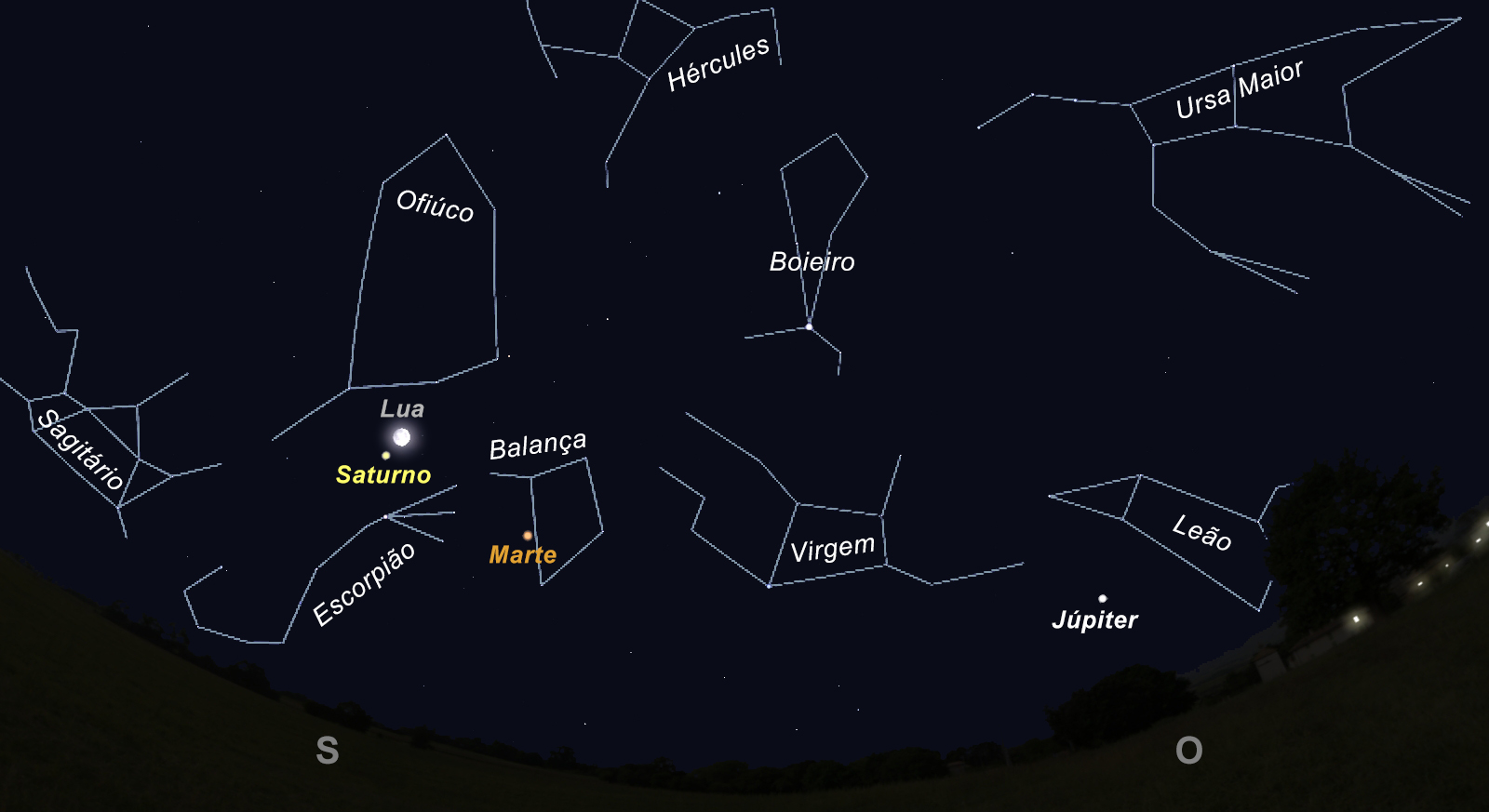 Figura 2: O trio da Lua, Saturno e Marte, virados a Sul, por volta da meia-noite do dia 19 de junho. (Imagem: Ricardo Cardoso Reis/Stellarium)