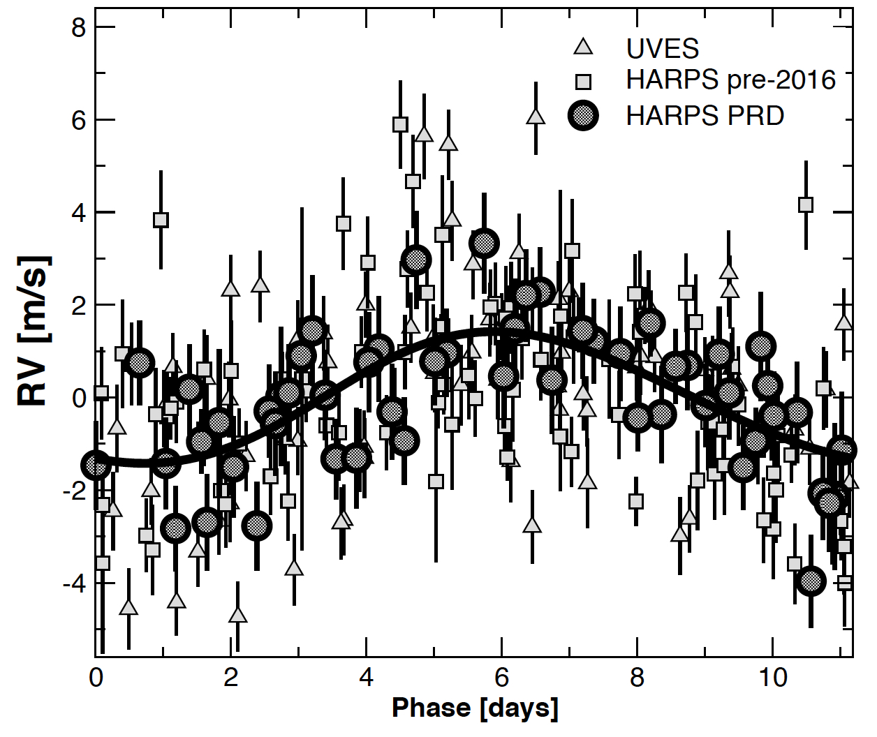 Figura 2 - As observações (triângulos, quadrados e círculos) dos deslocamentos das linhas espectrais de Proxima Centauri obtidas pelo HARPS e UVES. A linha negra mostra o modelo que melhor se ajusta às observações. A amplitude da variação permite estimar a massa mínima do planeta. Crédito: Anglada-Escudé et al.