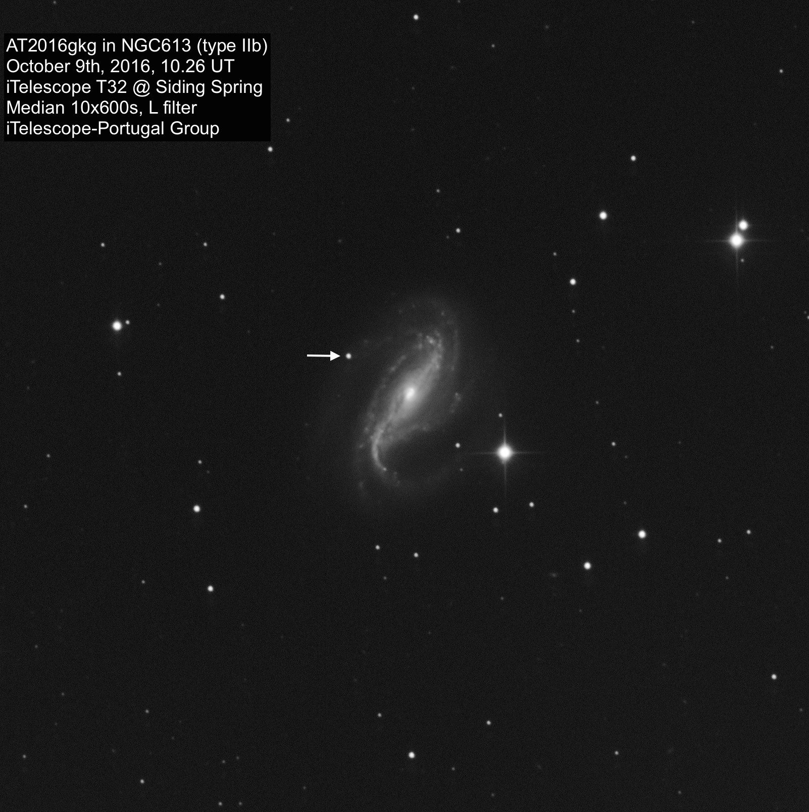 Figura 1 - Uma supernova na galáxia NGC613, situada a apenas 67 milhões de anos-luz na direcção da constelação do Escultor. Crédito: Grupo i-Telescope Portugal.