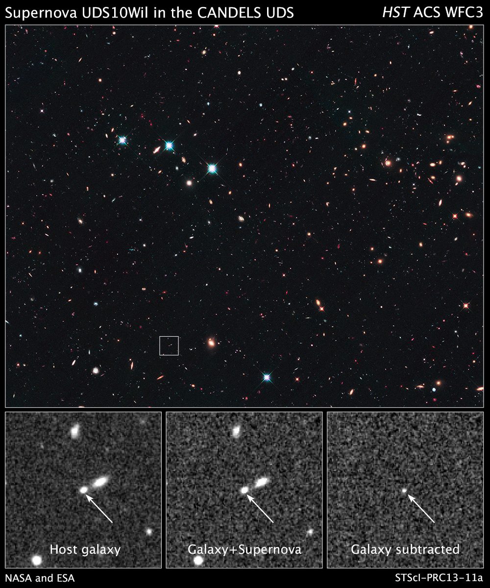 De facto, a supernova mais distante detectada até à data é fruto de um desses programas, o CANDELS Ultra Deep Survey, que usa o telescópio Hubble para observar uma região muito pequena do céu. A luz da UDS10Wil, como foi designada, demorou 10 mil milhões de anos a viajar até nós antes de ser registada pelas câmaras do telescópio espacial. Mas o CANDELS UDS é uma excepção e apenas são conhecidas algumas centenas de supernovas para galáxias com tempos de viagem da luz entre 2 mil milhões e 10 mil milhões de anos.